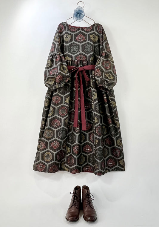 【大島紬】亀甲華紋着物リメイク「ふんわりリボンワンピースドレス」