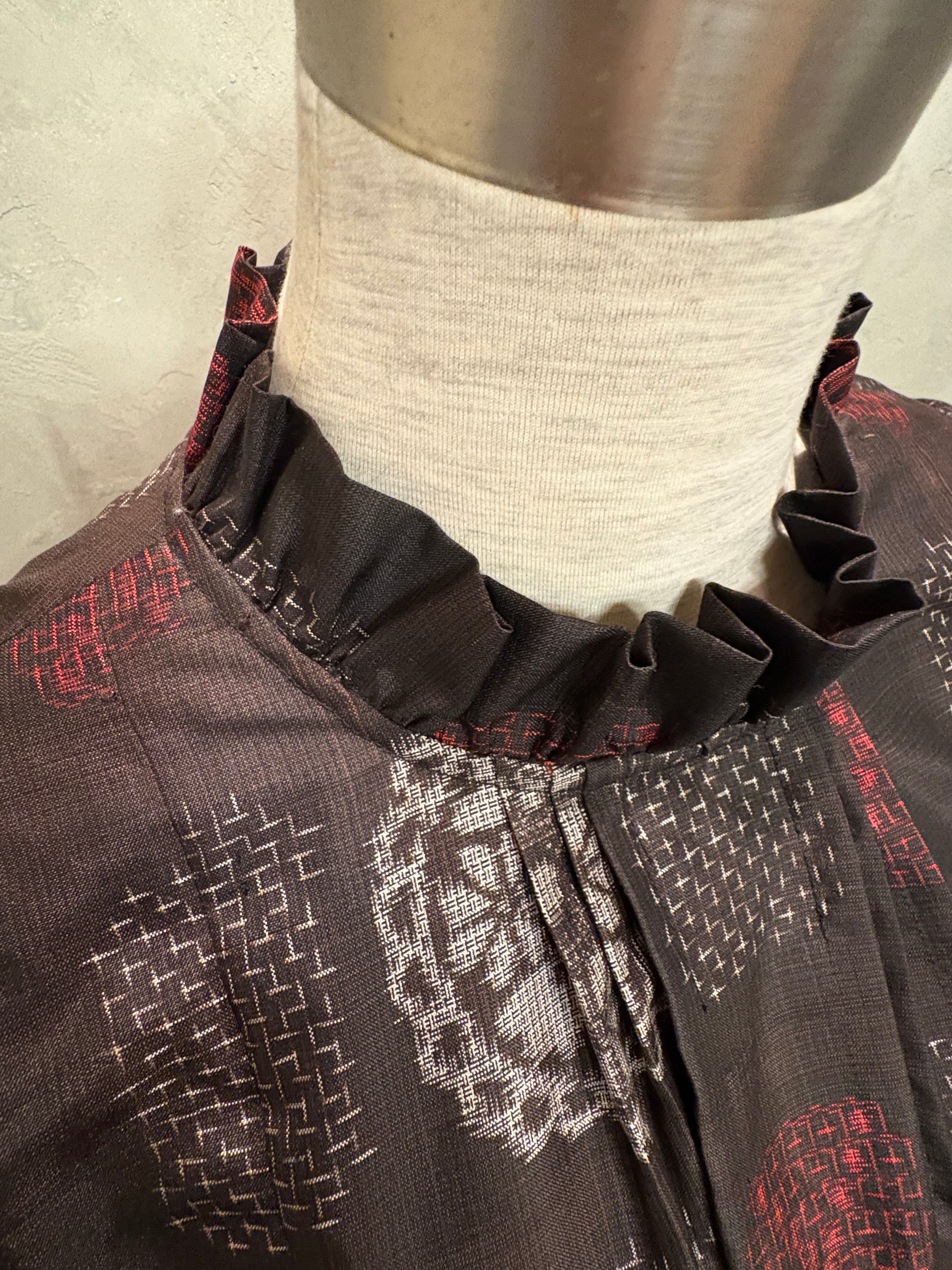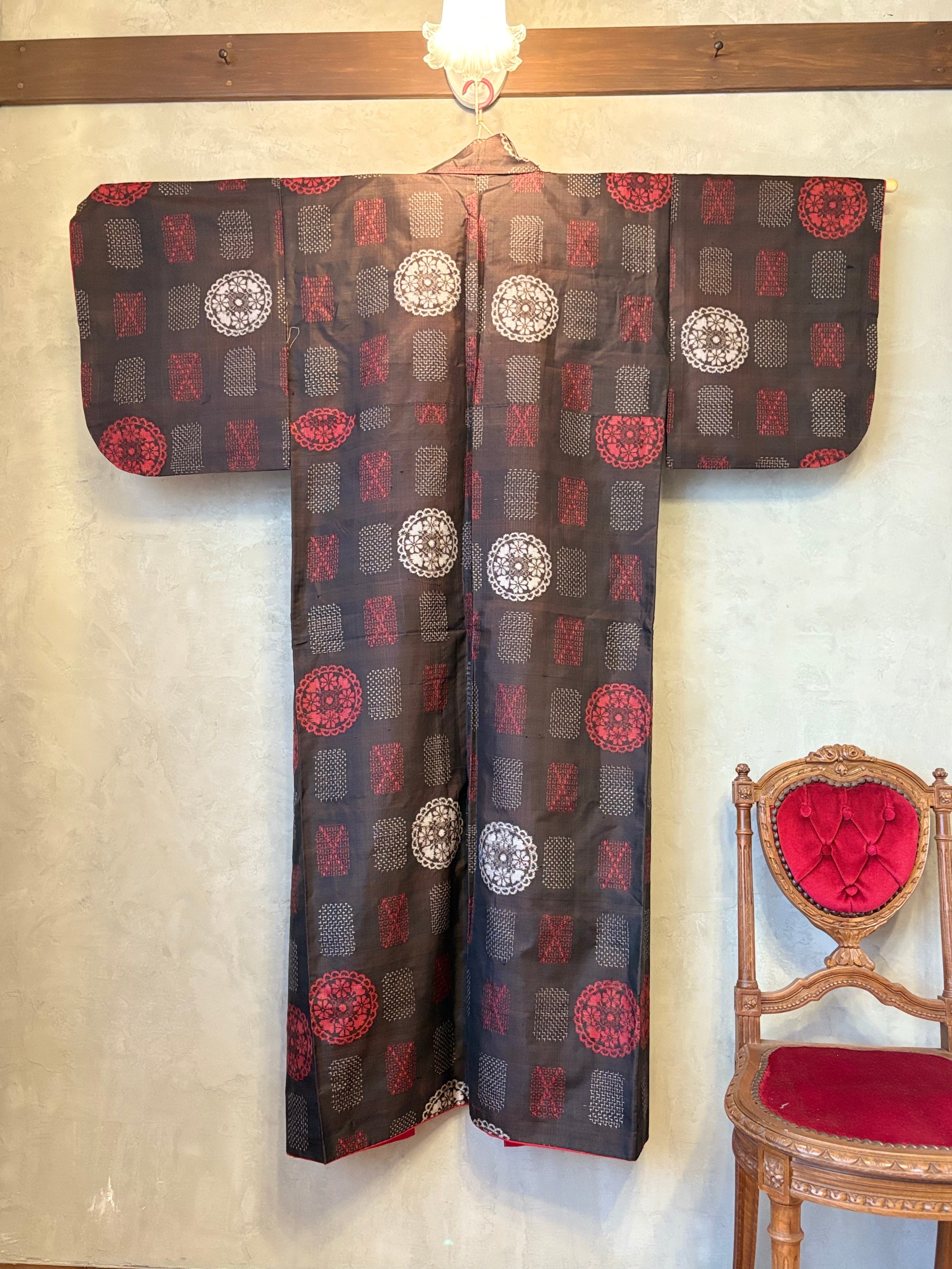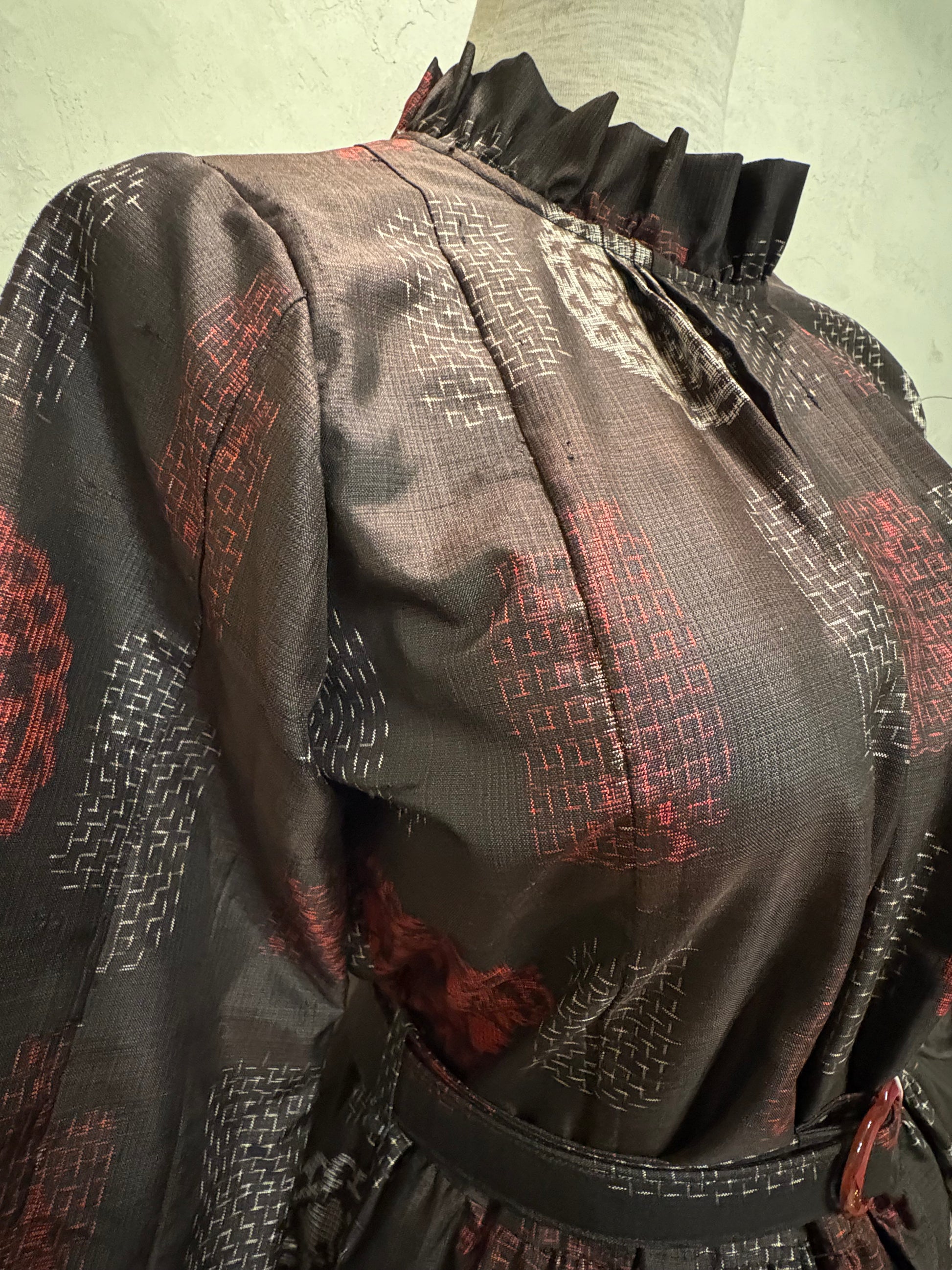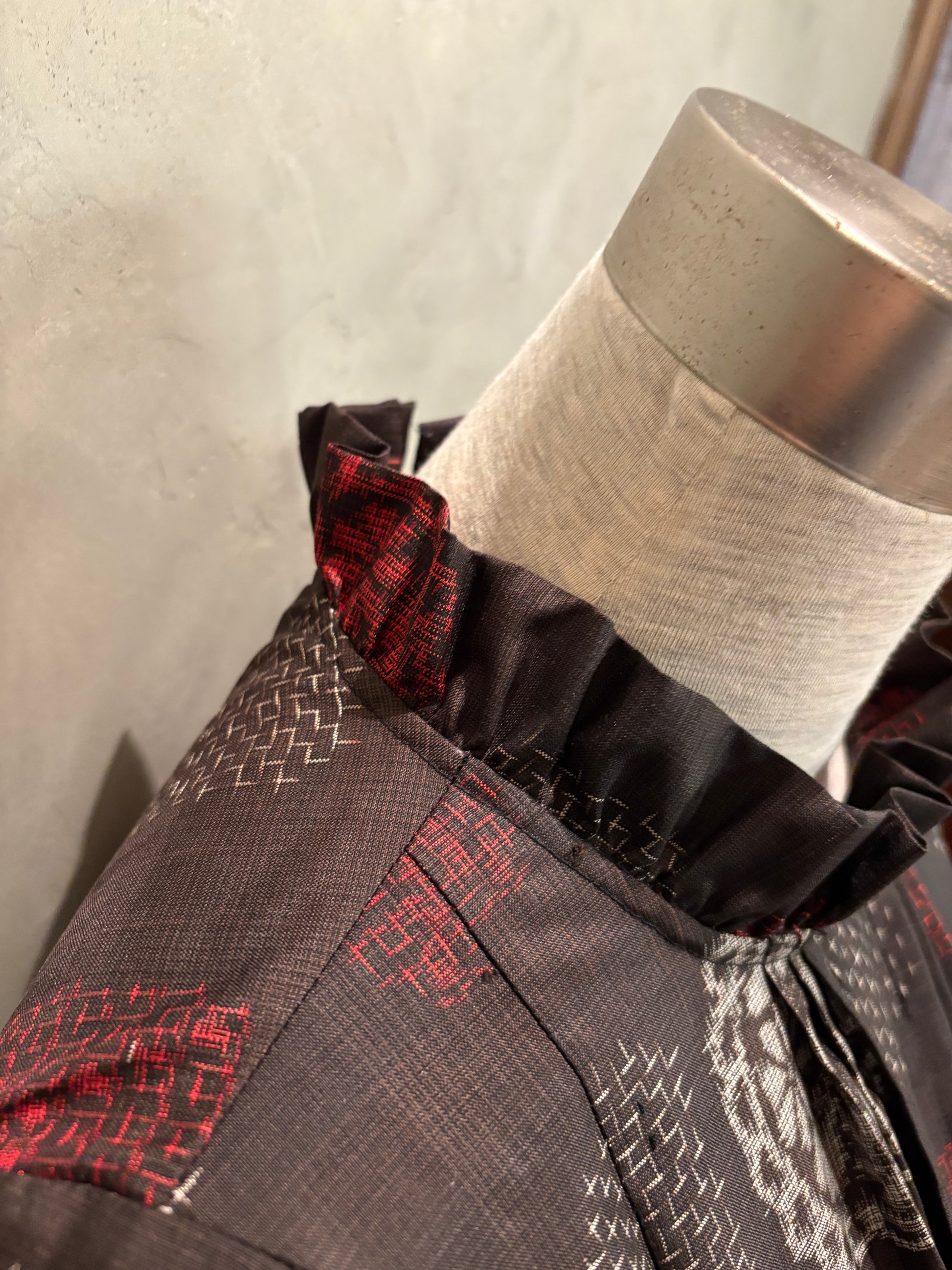 こちらの大島紬は、アンティーク物のため、生地の痛みや元々の織の荒さ等もある場合がございます。お着物をほどいた後に洗いをしていますが、経年劣化の色焼けやシミ等は落ちません、これらは生地の歴史と受け止めて、制作しています。
