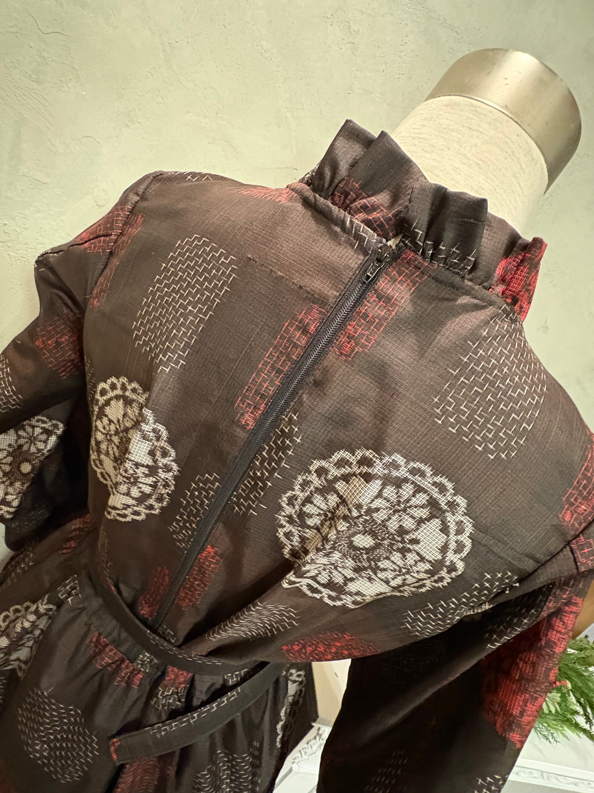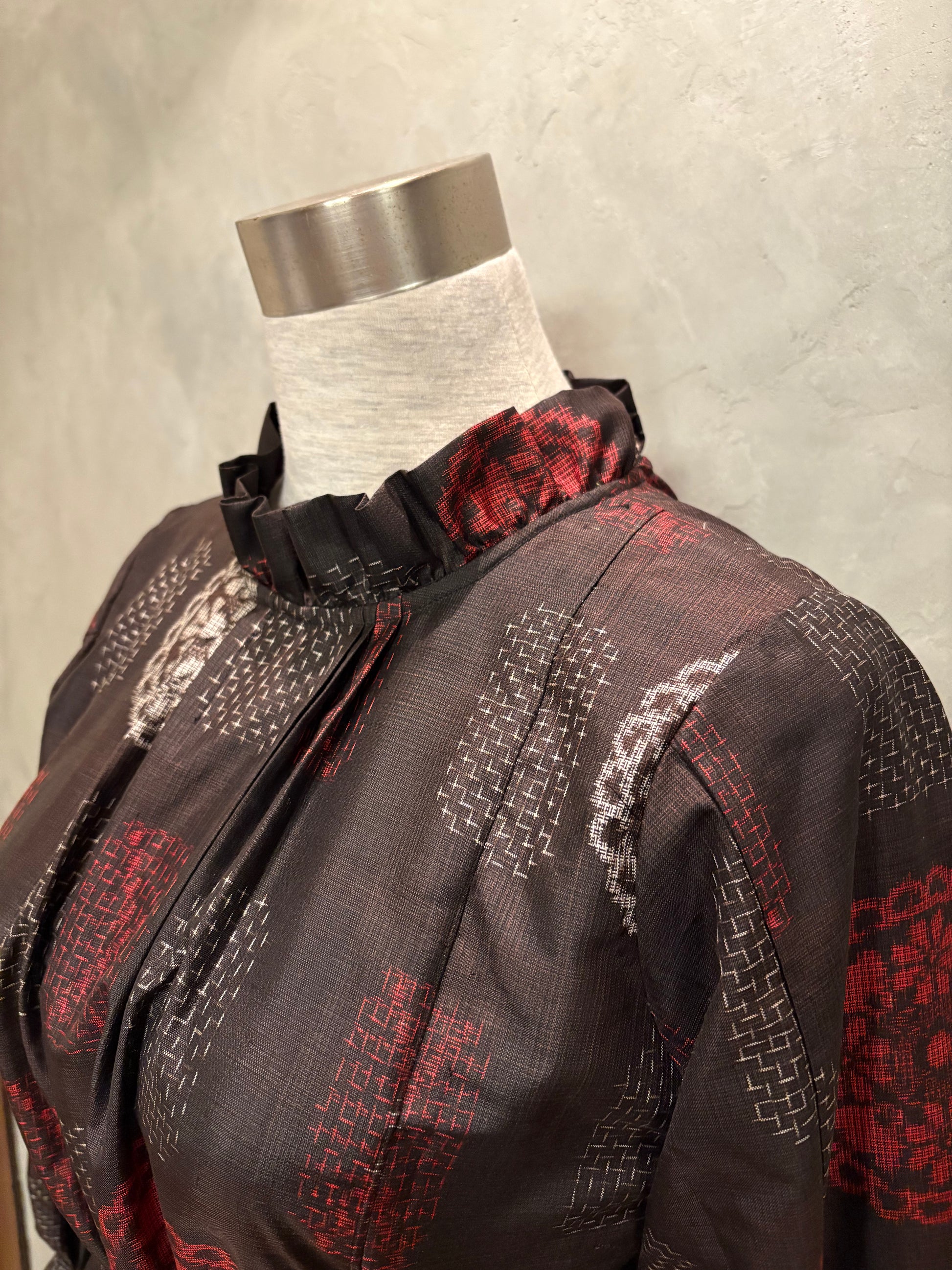 着物として着られていたものですので、所々に落ちないシミや折シワ跡・針跡、色褪せ等がありますが、なるべく目立たないような場所を心がけています。また、それも着物リメイク洋服のデザインの一種として取り入れています。
